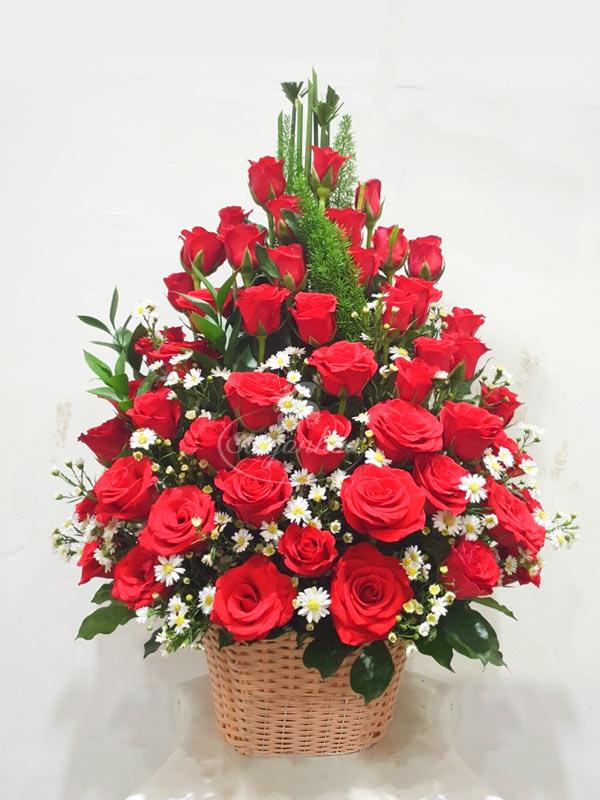 Quy cách: hoa hồng đỏ, hoa babi, hoa lá phụ theo mùa...
